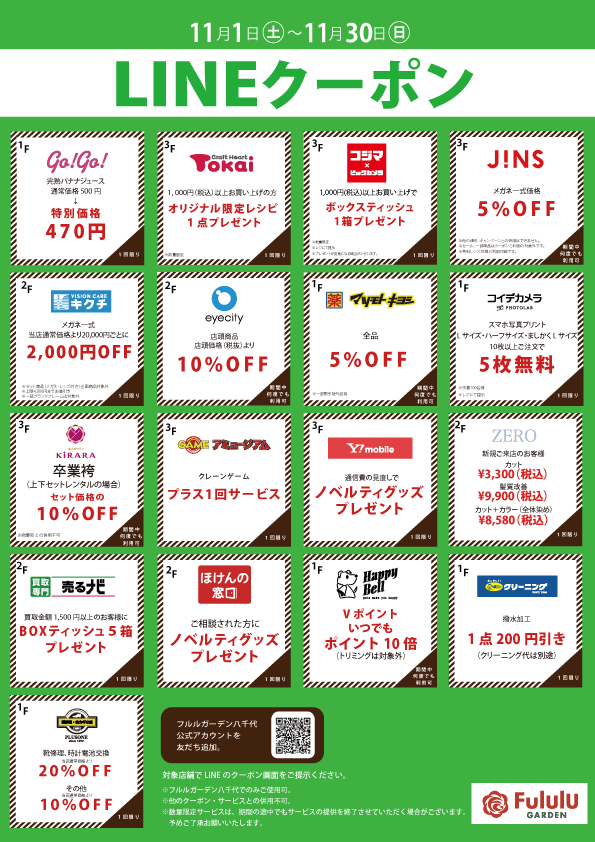 - 【フルル】LINEお友だち限定 11月LINEクーポンキャンペーン