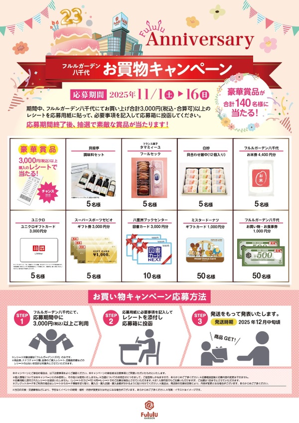 ※当選についてのお問合せにつきまして、ご返答致しかねますので、あらかじめご了承ください。 ※応募箱投函後に応募内容の変更はできません。 ※同一レシートでのご応募は無効とさせていただきます。 ※お1人様何回でもご応募いただけますが、ご当選は1回までとさせていただきます。 ※写真・イラストはイメージです。 ※応募用紙は、11/16(日)21時までに応募箱にご投函ください。郵送等の応募の受付は致しかねます。 ※当日の天候・交通事情等により、イベントの時間・場所・内容が変更または中止になる場合がございます。