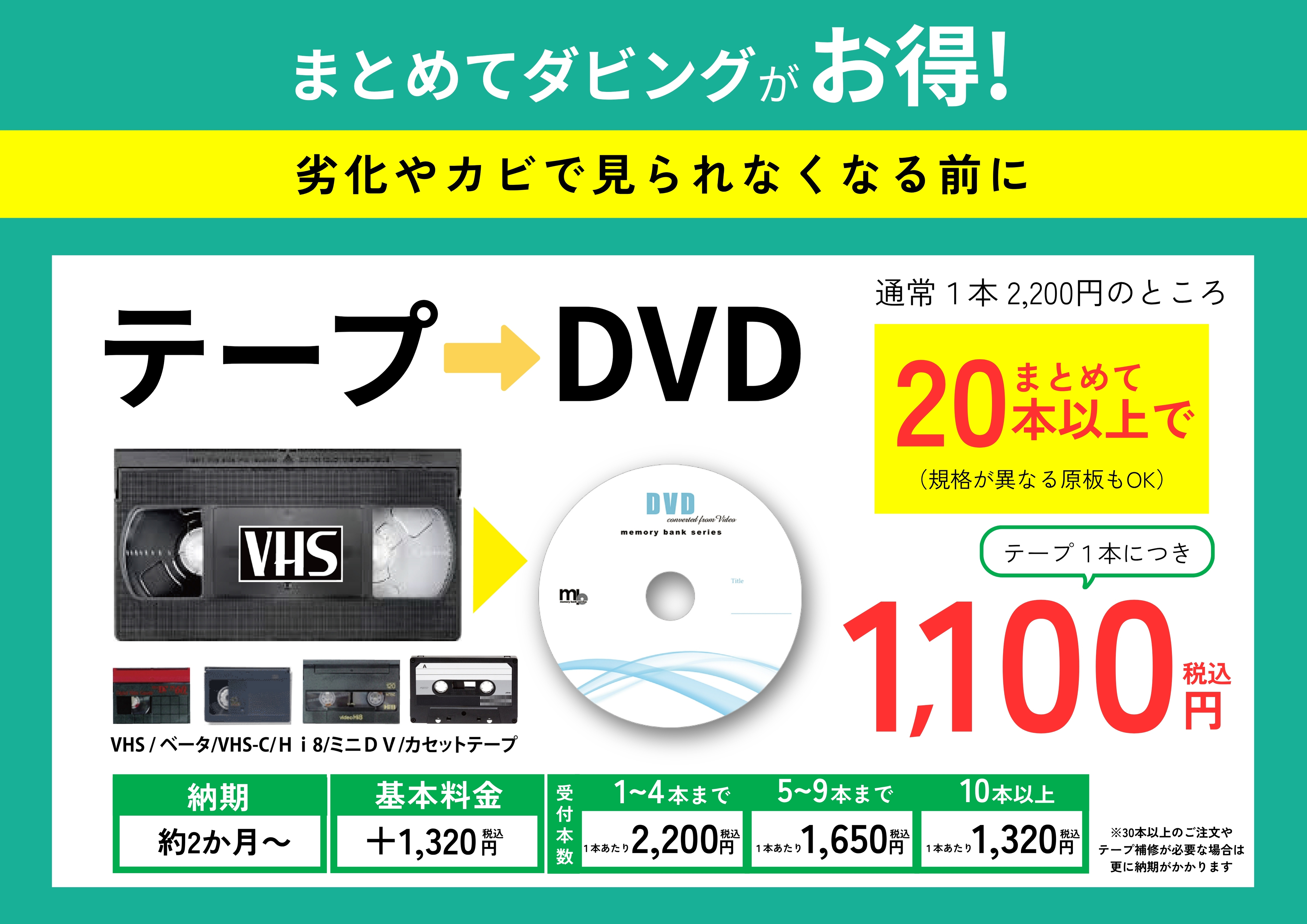 ※当サービスは、1本のテープにつき1枚のDVDへの書込みとなります。複数のテープをまとめることはできません。